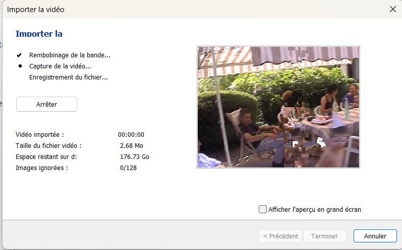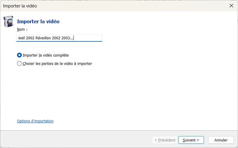 Si l'on a sélectionné Importer la vidéo complète Clic Suivant